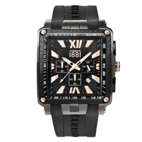 MONTRE CERRUTI 1881 HOMME BRACELET SILICONE NOIR CADRAN CARRE INDEX DORE ROSE CHRONOGRAPHE