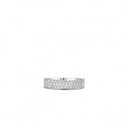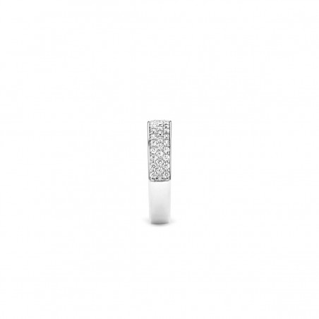 Cet anneau serti rail affiche trois rangées d'oxyde zirconium et cela sur la moitié de son pourtour.