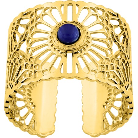 Bague Ajustable Amporelle en acier doré ajourée et Pierre bleue synthétique