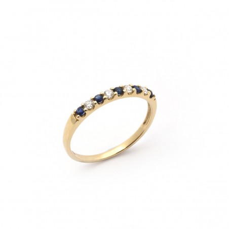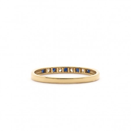 La bague présentée ici est en or jaune. Minimaliste et élégante, cette bague aux allures d'alliance demi-tour alterne diamants et saphirs.