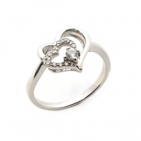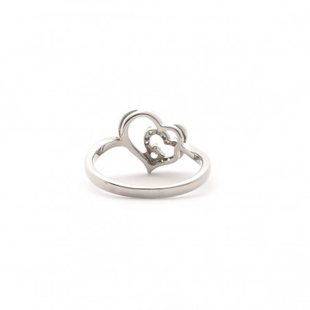Cette bague est en argent 925/000, elle se compose de deux coeurs enlacés dont un incrusté de différentes tailles d'oxyde de zirconium.
