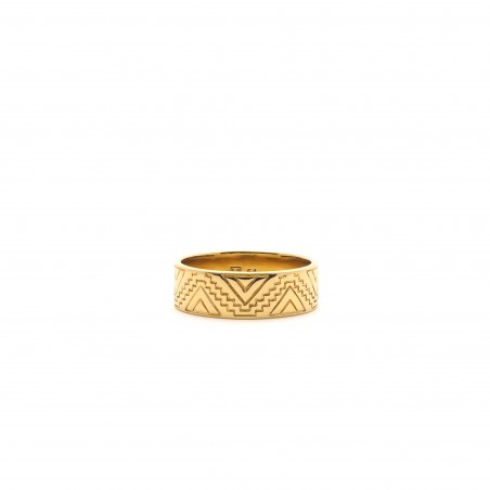 Craquez pour une touche d'exotisme avec cette bague de chez Carador. La simplicité de l'anneau en plaqué or, large de 6 mm, où sont gravés des motifs d'inspiration ethnique en font un bijou facile à porter.