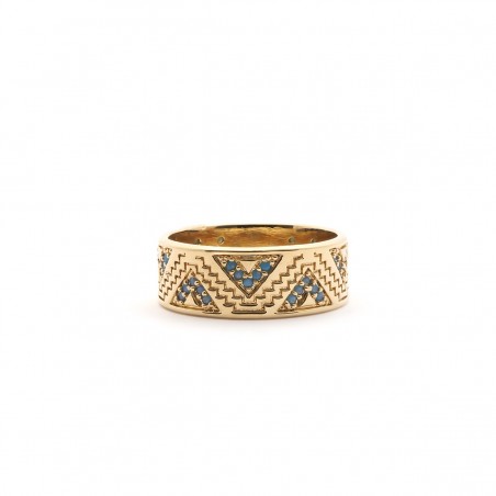 Cet anneau de chez Carador, d'une largeur de 7 mm, affiche un très joil motif ethnique. En plaqué or et turquoise, cette bague vous séduira par sa délicatesse et son originalité.
