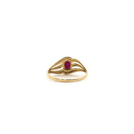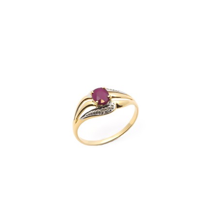 La bague proposée ici est un bijou en or jaune et blanc 18 cts. Le corps fin de cette bague se divise en trois branches formant des vagues ornées de diamants et subimant un rubis de forme oval.