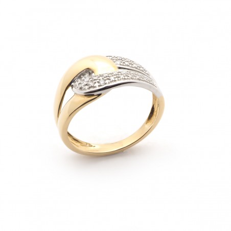 Carador vous propose cette bague en or 375/000 bicolore avec diamants. Ce bijou est composé de deux anneaux qui se croisent, l'un d'eux en or jaune 375/000 et l'autre en diamants.