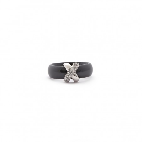 Cette sublime bague, signée Carador, vous offre les trois! Un anneau en céramique noir affiche deux anneaux enlacés d'argent dont l'un serti d'oxydes de zirconium.