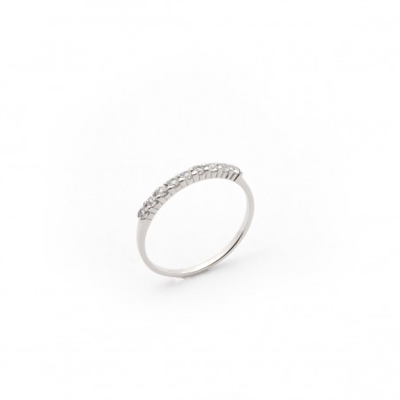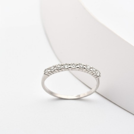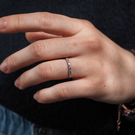 Son anneau fin en or blanc 375/000 est serti demi-tour d'oxydes de zirconium sertis griffe.