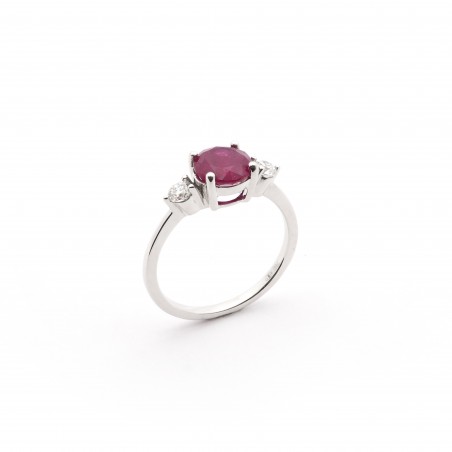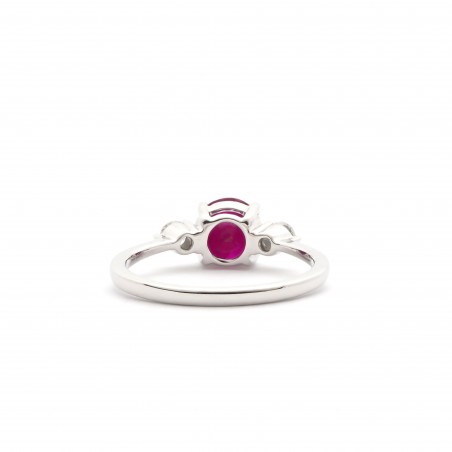 Présentant un corps fin, la bague vous révèle un sublime rubis rond de 1,5 cts mis en valeur par l'écat de deux diamants de 0,250 cts situés de part et d'autre de la pierre maitresse de ce bijou.