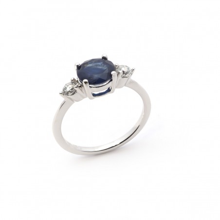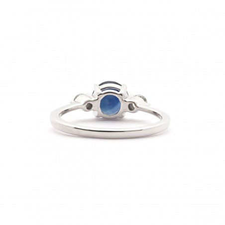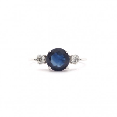 Présentant un corps fin, la bague vous révèle un sublime saphir rond de 1,5 cts mis en valeur par l'écat de deux diamants de 0,250 cts situés de part et d'autre de la pierre maitresse de ce bijou.