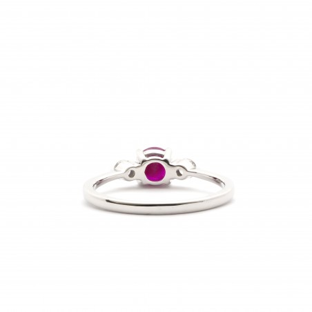 Présentant un corps fin, la bague vous révèle un sublime rubis rond de 0,60 cts mis en valeur par l'écat de deux diamants de 0,20 cts situés de part et d'autre de la pierre maitresse de ce bijou.