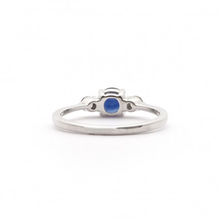 Présentant un corps fin, la bague vous révèle un sublime saphir rond de 0,60 cts mis en valeur par l'écat de deux diamants de 0,20 cts situés de part et d'autre de la pierre maitresse de ce bijou.