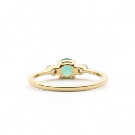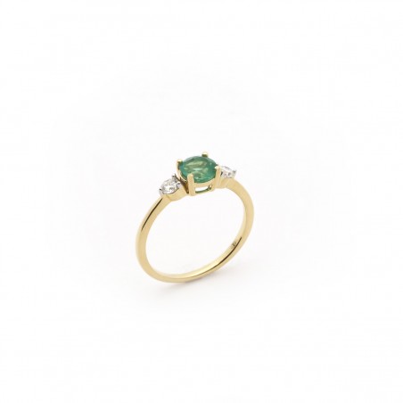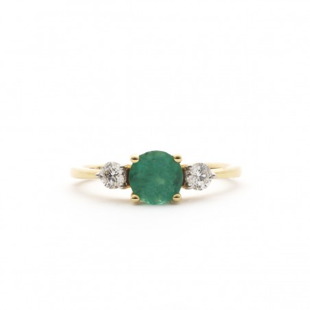 Présentant un corps fin, la bague vous révèle une ravissante émeraude ronde de 0,60 cts mis en valeur par l'écat de deux diamants de 0,20 cts situés de part et d'autre de la pierre maitresse de ce bijou.