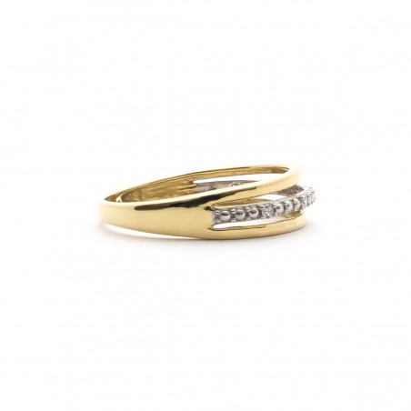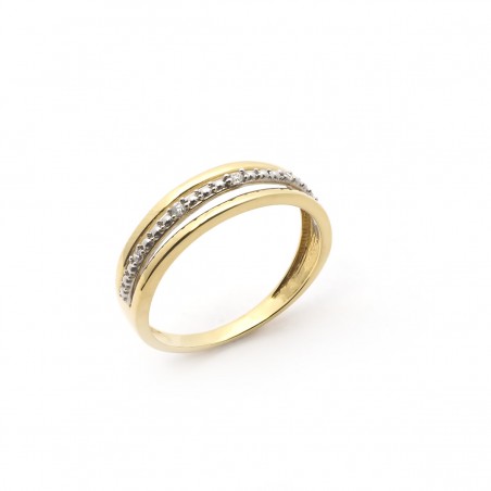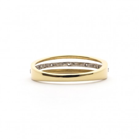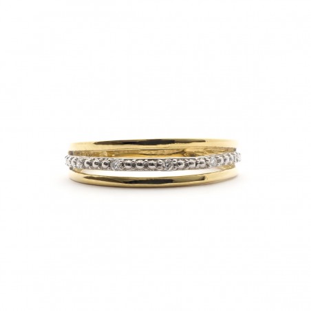 Votre bijouterie Carador vous propose de venir découvrir sur sa boutique en ligne une large gamme de bijoux or 18 k et diamant. La bgaue présentée ici est un bijou en or jaune et blanc faisant illusion de porter trois anneaux dont celui de centre est orné de diamants 0,04 cts.