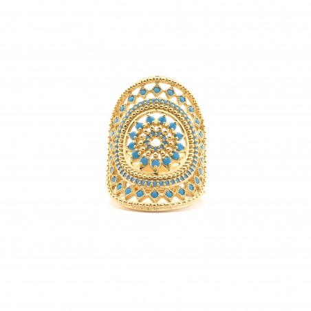 Affirmez vos goûts pour l'originalité avec cette bague de chez Carador. Révélant un ravissant motif aztèque, ce bijou, orné de pierres turquoises, saura sublimer votre main.
