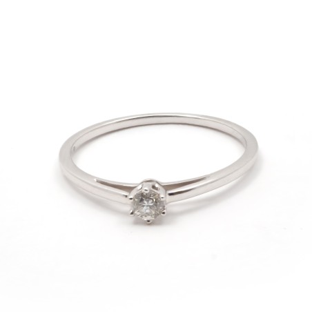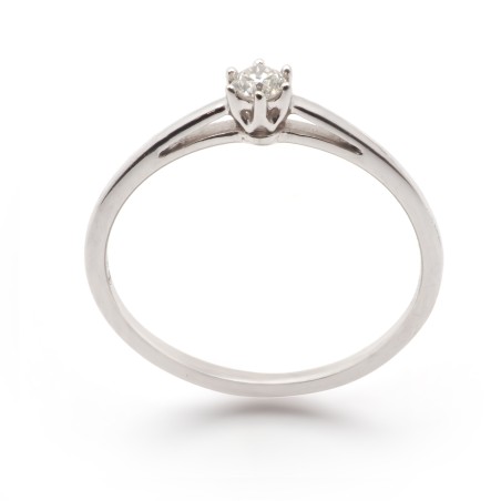 Cette bague est en or blanc 750/000. Le diamant, de 0.09 cts est de forme ronde.