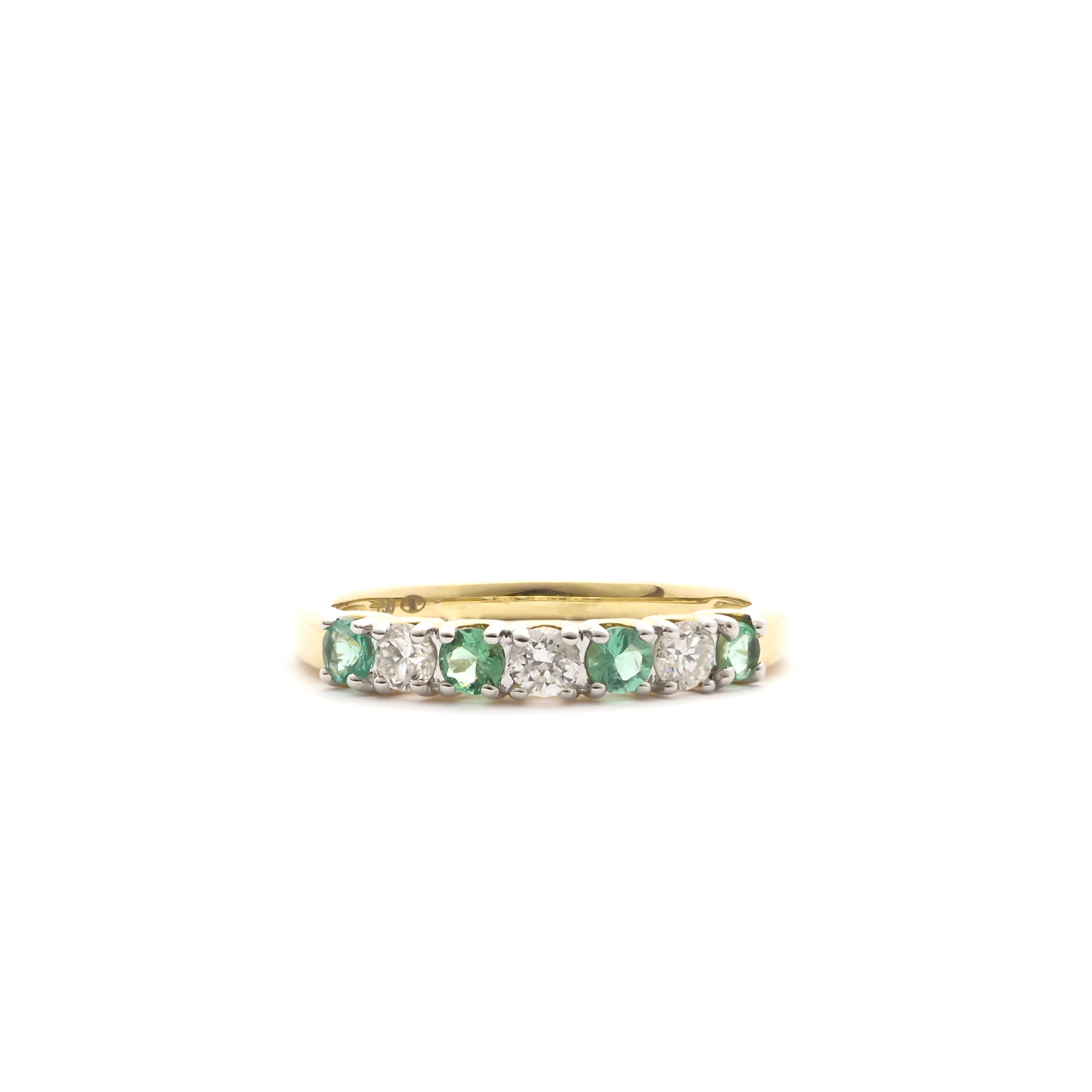 Votre bijouterie Carador, présente à vos côtés depuis plus de 100 ans, vous propose des bijoux de qualité aux styles intemporel, original ou tendance. Avec cette bague de style alliance demi-tour, vous faites le choix d'un bijou élégant et chargé de signification. La bague est en or jaune 750/000, surmonté de diamants et d'émeraudes sertis griffe.