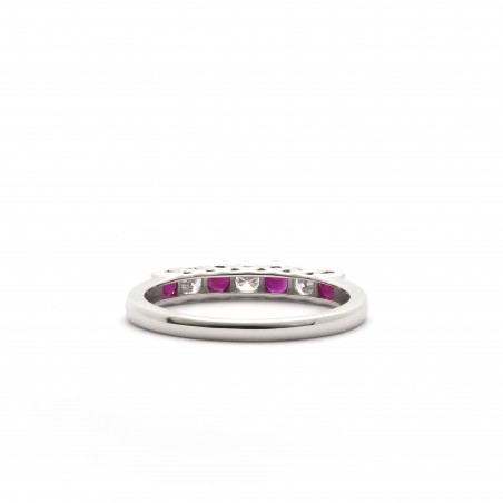 Votre bijouterie Carador, présente à vos côtés depuis plus de 100 ans, vous propose des bijoux de qualité aux styles intemporel, original ou tendance. Avec cette bague de style alliance demi-tour, vous faites le choix d'un bijou élégant et chargé de signification. La bague est en or blanc 750/000, surmonté de diamants et de rubis sertis griffe.