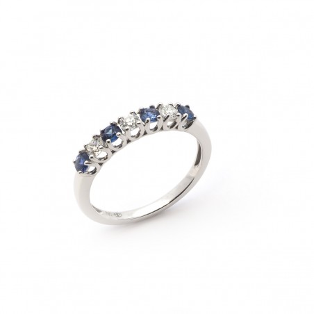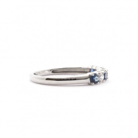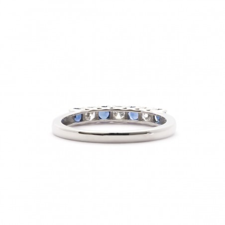 Votre bijouterie Carador, présente à vos côtés depuis plus de 100 ans, vous propose des bijoux de qualité aux styles intemporel, original ou tendance. Avec cette bague de style alliance demi-tour, vous faites le choix d'un bijou élégant et chargé de signification. La bague est en or blanc 750/000, surmonté de diamants et de saphirs sertis griffe.