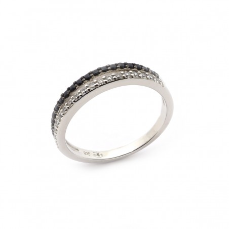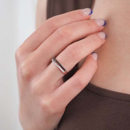 Cette bague en argent 925/000 se compose d'un anneau serti de deux rangs d'oxydes de zirconium un blanc l'autre noir.