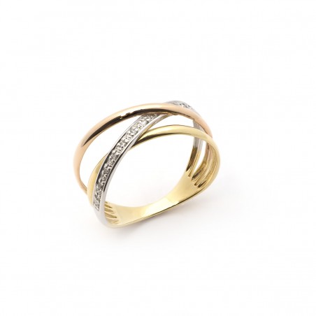 Votre bijouterie CARADOR en ligne vous propose cette bague en or 750/000 jaune, blanc et rose. La tête de bague est composée d'une multitudes de diamants sertis grain. Composé de trois anneaux entremelés cette bague est un mariage parfait entre les trois couleurs.