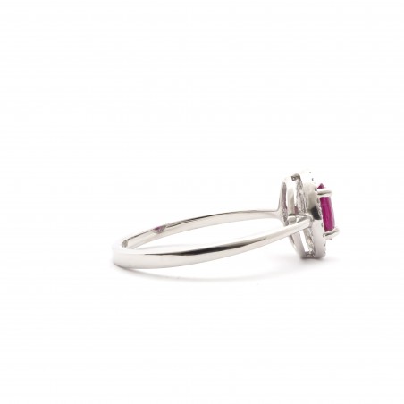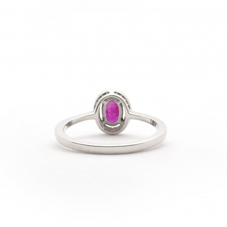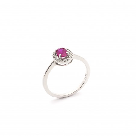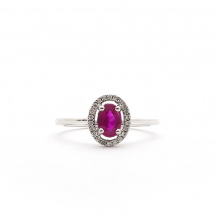 Ce bijou de forme oval en or 750/000 et orné d'un rubis d'une dimension de 0.6 x 0.4 mm. et serti d'une multitude de diamants.