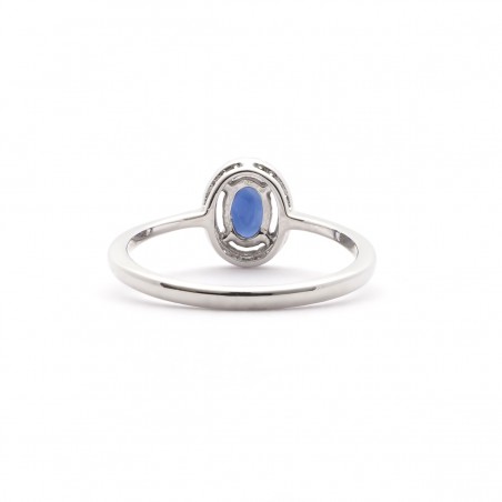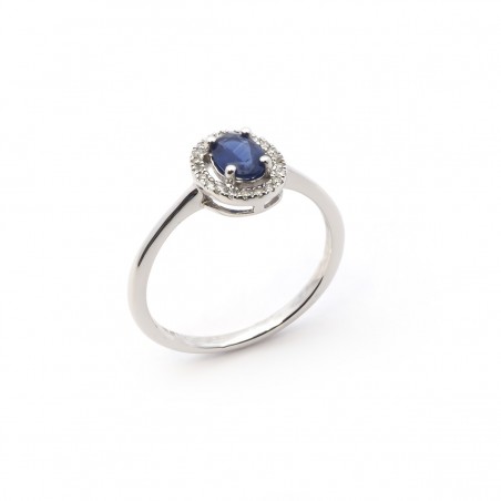 Ce bijou de forme oval en or 750/000 et orné d'un saphir d'une dimension de 0.6 x 0.4 mm. et serti d'une multitude de diamants.