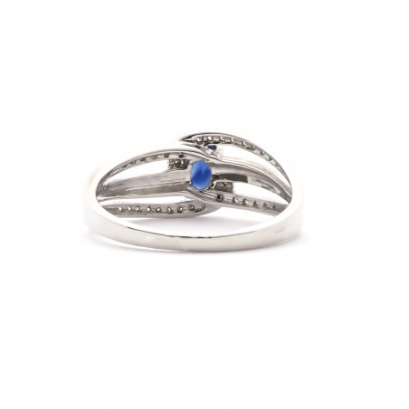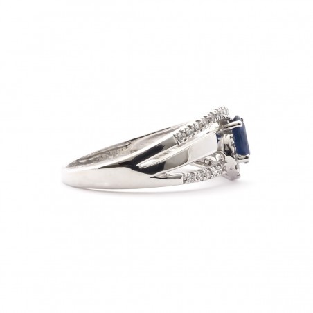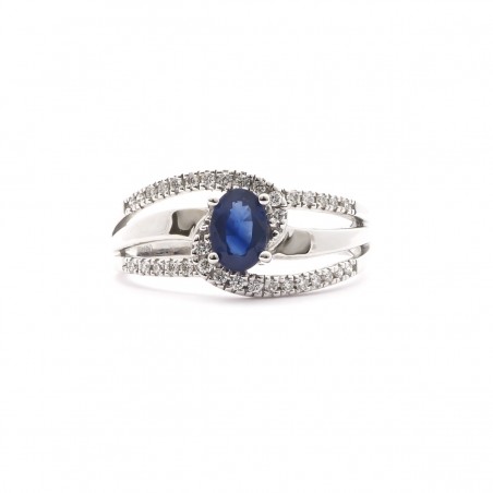 Elle se compose d'un anneau en or blanc 750/000 orné de diamants blancs rehaussé d'un saphir de couleur bleue.