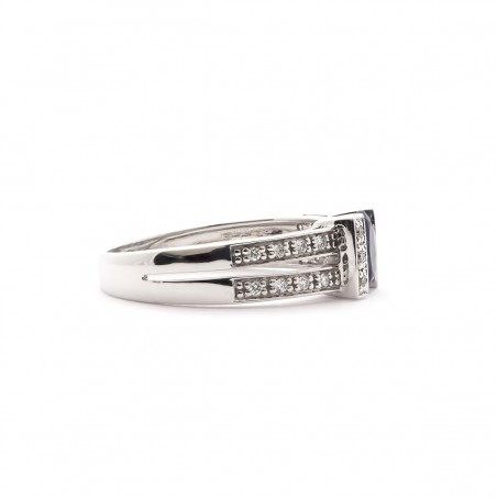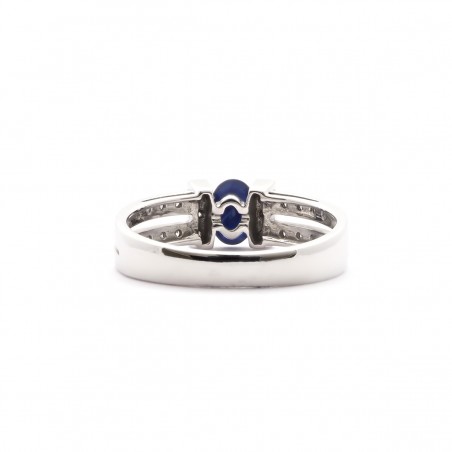 Riche de son savoir-faire centenaire, votre bijouterie Carador vous accompagne dans les événements marquants de la vie : mariage, naissance, baptème... La collection éternelle, composée de bijoux or 750/000 et diamants, vous offre un large choix de bijoux précieux de qualité. La bague présentée ici est en or blanc. Son corps se sépare en deux et met ainsi en valeur deux barettes empierrées de diamants sublimant un saphir de forme oval. De style intemporel, cette bague est un bijou de valeur que l'on se transmet de mère en fille.