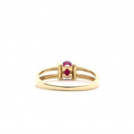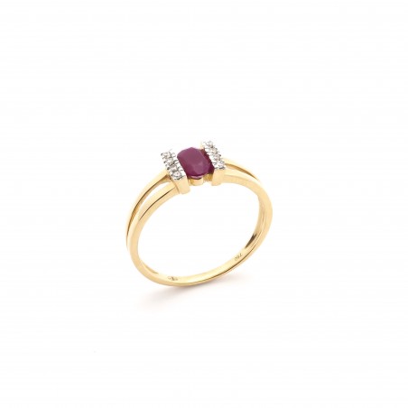 La bague présentée ici est en or jaune. Son corps se sépare en deux et met ainsi en valeur deux barettes empierrées de diamants sublimant un rubis de forme oval.