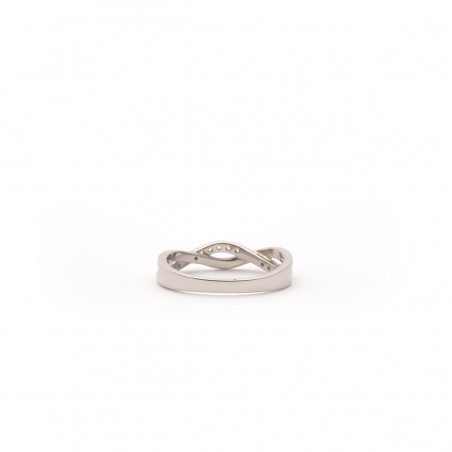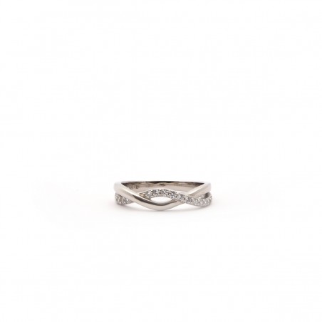Cet anneau affiche en demi-tour deux brins d'argent s’entremêlant et dont l'un est incrusté d'oxydes de zirconium.