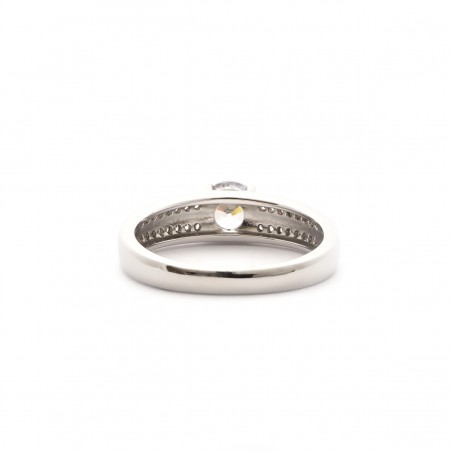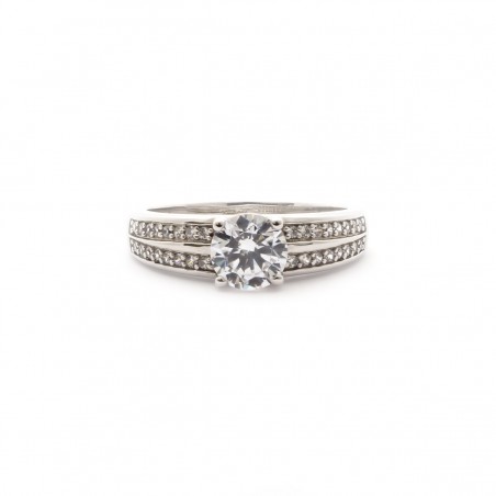 Cette bague est en argent 925/000, elle se compose d'un oxyde de zirconium principal serti quatre griffes accompagné par quatres pavé d'oxydes.