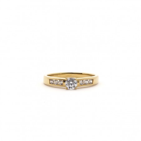 Cet anneau est composé de deux espaces rectangulaires de trois oxydes de zirconium incrustés entourant un solitaire de la même matière étincelante.