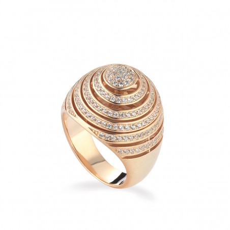 Un anneau puissant en argent couleur or rose est surmonté d'une partie bombée formée de bandes serties d’oxydes de zirconium tournant délicatement sur leur axe et au sommet de cette magnificence un dôme fixe et scintillant.
