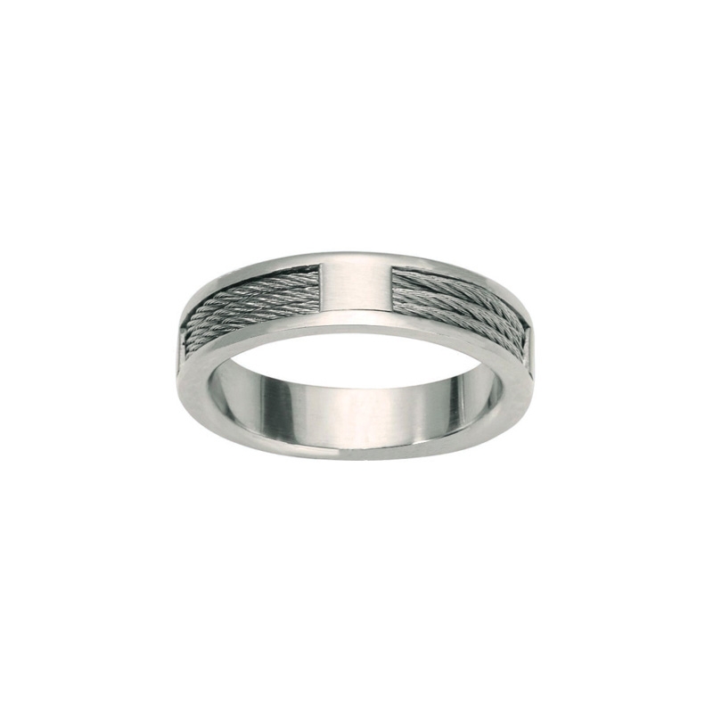 Jouant sur l’aspect brut des câbles d’acier ce modèle est composé d’un anneau dont le motif est 3 brins d’acier tressés.