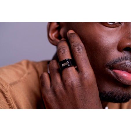 Jouant les couleurs et sur les formes ce modèle se compose d’une partie noire avec le plateau central carré ayant comme motif un rectangle argenté lisse au bord duquel se retrouve un carré-écrin pour un oxyde de zirconium.