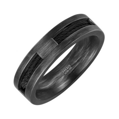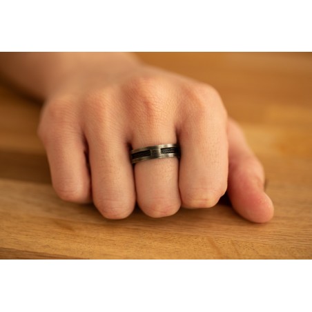 Jouant sur les relief et les couleurs, cette anneau présente un câble noir en son centre.