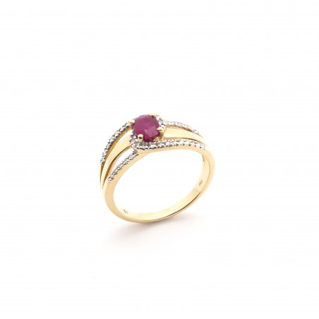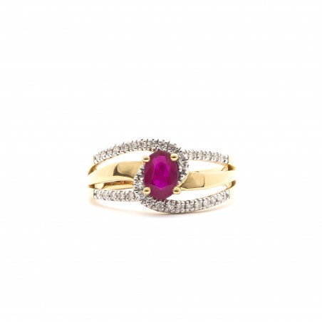 Le corps de cette bague se sépare en trois branches dont les deux extérieures empierrées de diamants viennent encercler un rubis de forme oval.