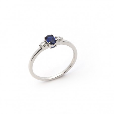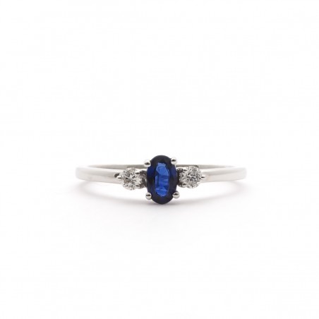 La bague joaillerie, en or blanc 750/000, révèle un saphir de 0,54 cts sublimé par deux diamants de 0,11 cts situés de part et d'autre.