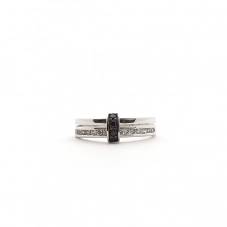 Elle se compose d'un anneau en or blanc 750/000 sertis d'oxyde de zirconium blanc et noir/gris en son centre.