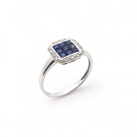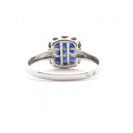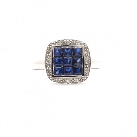 Cette bague est en or blanc 750/000, saphir et diamants. La tête de bague révèle une base carrée emplie d'un saphir de forme carré de 0,65 cts en son centre. On retrouve également des diamants tout autour du saphir. Comment ne pas craquez devant cette ravisante bague qui deviendra un bijou qui se transmet de génération en génération?