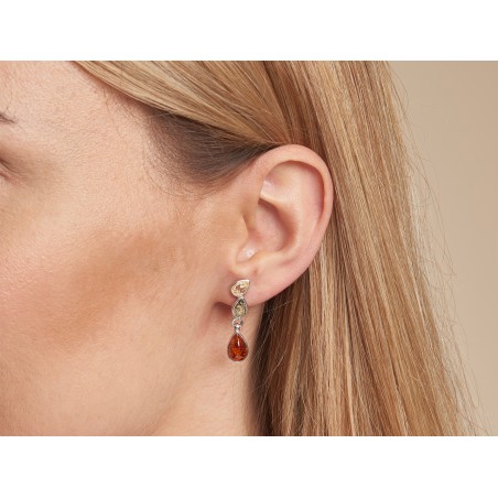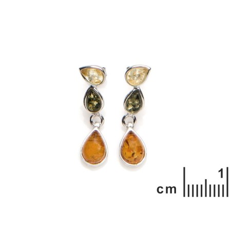 Cette magnifique paire de boucles d'oreilles d'ambre Carador est en argent 925/000. Ce bijou vous dévoile trois pendentifs d'ambre en forme de goutte aux couleurs automnales : jaune, vert et marron.