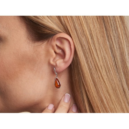 Ces boucles d'oreilles en argent sont en forme de goutte d'eau avec incrustation d'ambre en son milieu.