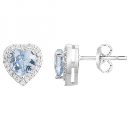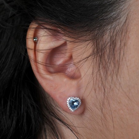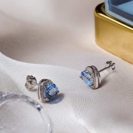 Boucles d'oreilles Clous Carador en argent et oxydes de zirconium blanc et bleu motif coeur