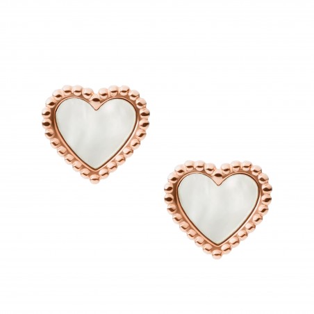 Ce modèle simple et discret dégage pourtant beaucoup douceur de par son adorable forme cœur en perle d’acier doré rose et par son intérieur de nacre à la délicieuse couleur blanche à reflets.