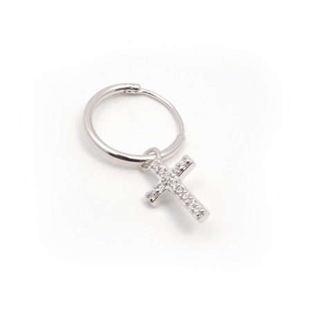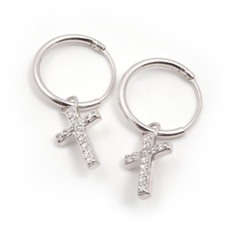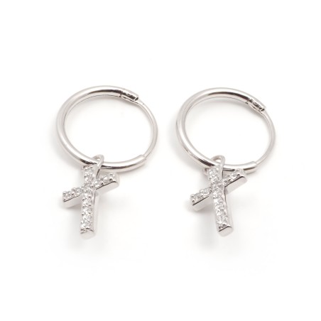 Boucles d'oreilles créoles femme carador en argent avec une croix suspendue et oxydes de zirconium