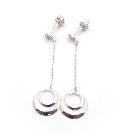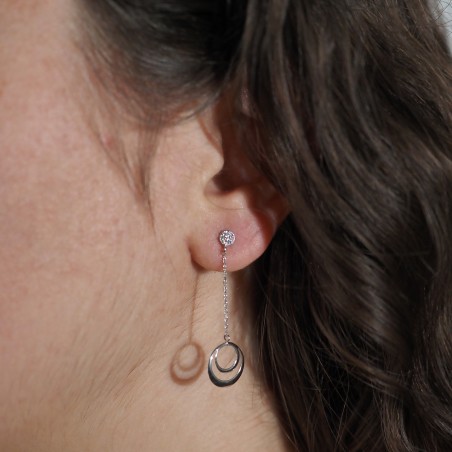 Munies d'un fermoir poussette, ces boucles d'oreilles se composent d'un clou pavé d'oxydes de zirconium, d'une chainette et d'un motif formé de deux cercles.