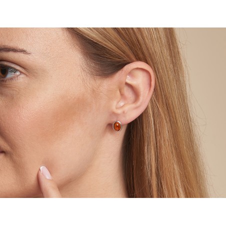 La monture de ces boucles, en argent 925/000, est finement travaillée de motifs délicats et dévoile une pierre d'ambre couleur cognac de forme ovale.