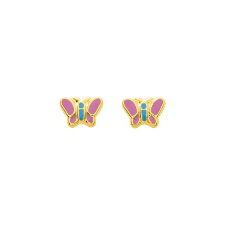 Boucles d'oreilles enfants OR Jaune 750/000 forme papillons avec laques rose et bleu
