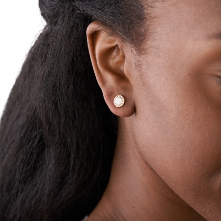 La paire de boucles d'oreilles Glitz signée Fossil affiche un design minimaliste très tendance. Confectionnées en acier doré rose, les boucles d'oreilles sont ornées de cristaux incolores et de jade blanc reconstituté. Dimensions : 1,1 x 0,8 cm