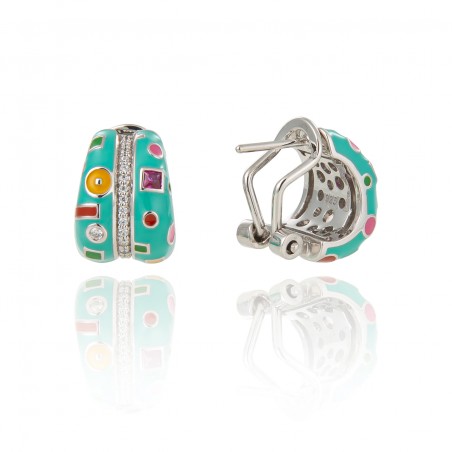 Ce modèle se compose d’un fermoir de type clip pour oreilles percées et d'une forme demi-créole orné de laque aux dessins géométriques multicolores et serti en son centre d’une ligne d'oxydes de zirconium.